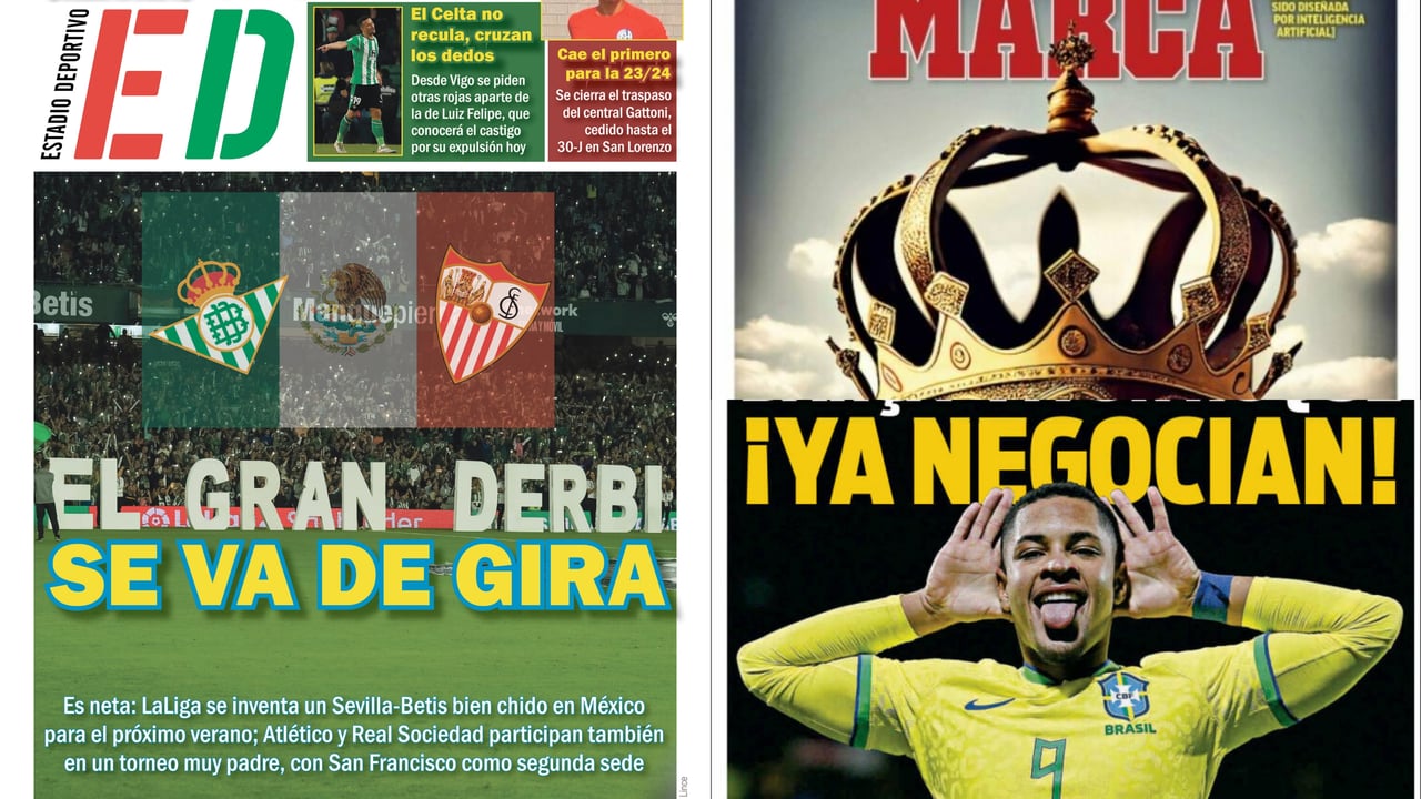 Las portadas de la prensa deportiva de este miércoles 8 de febrero llegan cargadas de información. Así en la portada de ESTADIO Deportivo abrimos con una de las noticias del día y es que Javier Tebas y LaLiga se llevarán El Gran Derbi entre Sevilla Fútbol Club y Real Betis a México el próximo verano. Será en una gira organizada por LaLiga, en la que también participará la Real Sociedad y el Atlético de Madrid. Aún no se conocen las fechas de los partidos pero sí que hay ya dos confirmados, un Atlético de Madrid-Sevilla en San Francisco (Estados Unidos) y un Sevilla-Betis en México.