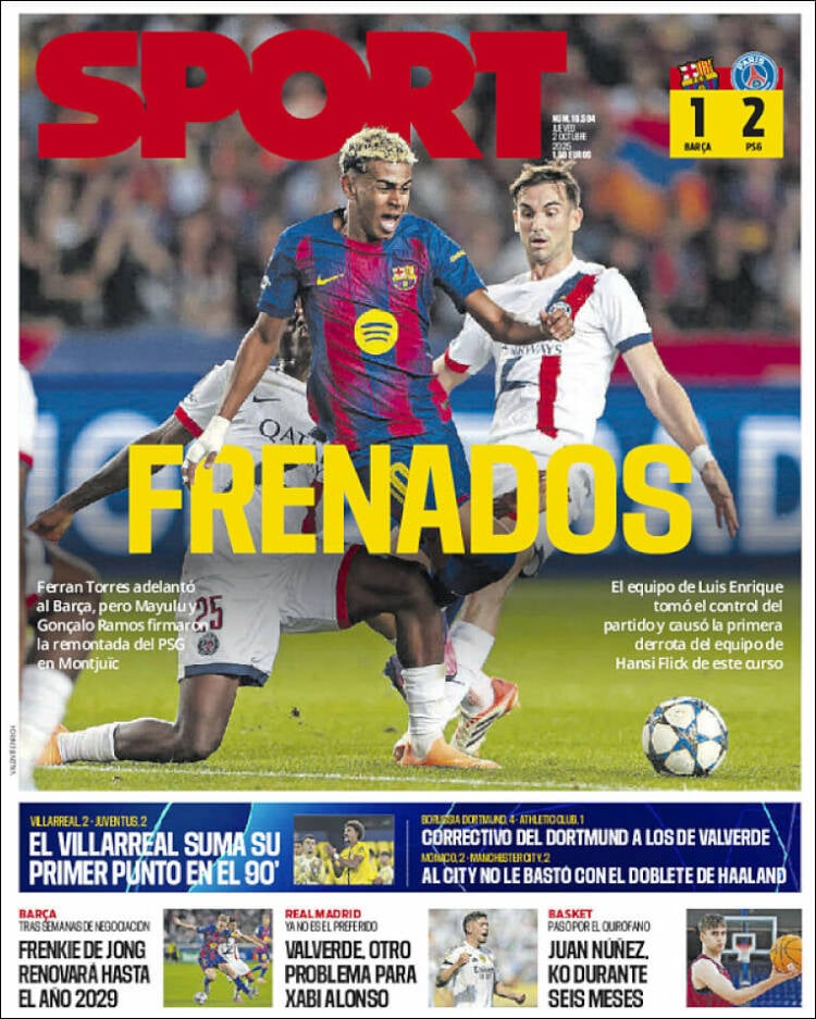 En las portadas catalanas, tanto Sport como Mundo Deportivo han ocupado su primera página con la derrota del FC Barcelona. El primero titula “Frenados”, para anunciar la primera derrota culé de la temporada, mientras que, “Final cruel” de los segundos, se centra en la remontada realizada en los últimos minutos. Además, Mundo Deportivo, en versión de Guipúzcoa, anuncia “Esto es la Champions” para reflejar el duro revés del Athletic al ser goleado por 4-1 ante el Borussia Dortmund.