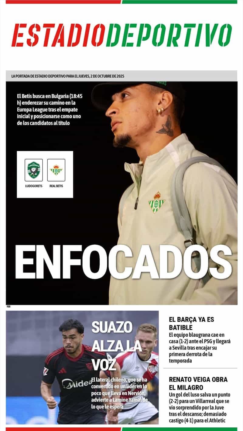 En Estadio Deportivo hemos abierto con la previa del partido de la Europa League entre Ludogorets y Real Betis, disputado a las 18.45 horas. El conjunto verdiblanco viaja hasta Bulgaria para buscar su primera victoria en el torneo, y reforzar su candidatura a hacerse con el título. Además, se recogen unas declaraciones de Suazo, lateral del Sevilla, sobre Lamine Yamal en la previa del encuentro ante el FC Barcelona en LaLiga.
