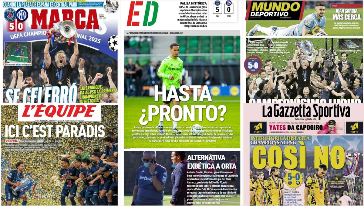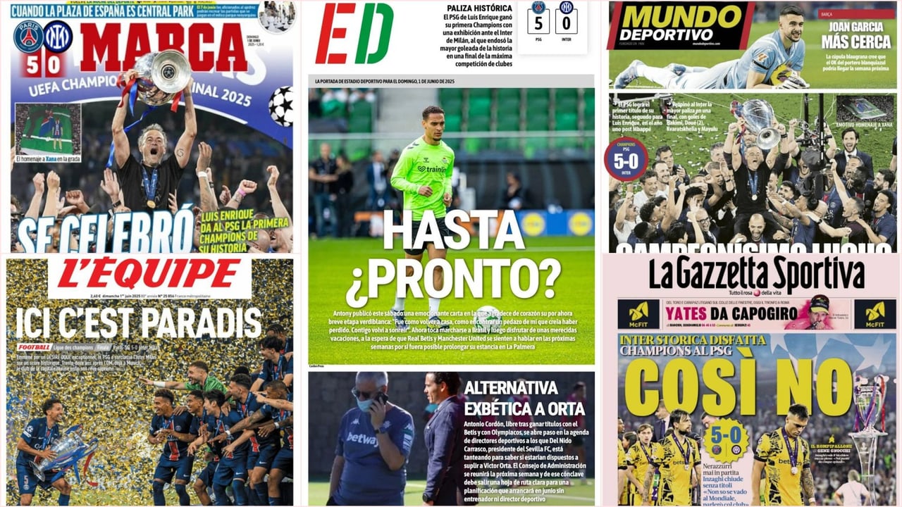 La traca final de la temporada de fútbol en Europa –a la espera de que se celebre el Mundial de Clubes– llegó anoche con la disputa de la gran final de la UEFA Champions League, en la cual el Paris Saint-Germain pasó por encima del Inter de Milán hasta el punto de endosarle un 5-0. Como es lógico, tal acontecimiento copa las portadas de todo el mundo, si bien también se tratas otros temas como el adiós de Antony al Real Betis, la opción de Antonio Cordón para la dirección deportiva del Sevilla FC y la cercana contratación de Joan García como nuevo portero del FC Barcelona.