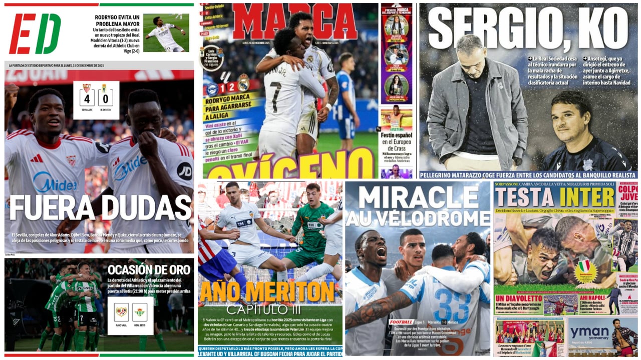El repaso de prensa a las portadas de los principales periódicos deportivos en este lunes, 15 de diciembre de 2025, tiene a un inspiradísimo Akor Adams como protagonista destacado de un domingo en el que el Sevilla FC despertó con una goleada y Xabi Alonso ganó un poco de oxígeno gracias al gol de Rodrygo Goes que dio el triunfo al Real Madrid; pero en el que Sergio Francisco y Luis Carrión no corrieron tanta suerte, siendo destituidos por la Real Sociedad y el Real Oviedo, respectivamente. Además, Hansi Flick alberga dudas con la portería del FC Barcelona y esta noche se cierra la jornada 16 de LaLiga EA Sports con un duelo entre el Rayo Vallecano y un Real Betis con seis bajas.