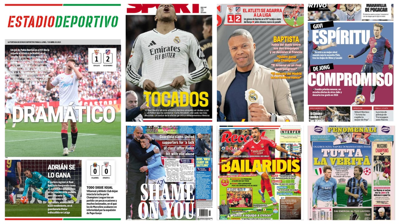 El resumen de prensa con las portadas de los principales periódicos deportivos en este lunes, día 7 de abril de 2025, llega marcado por el tanto en el último minuto que dio la victoria al Atlético de Madrid en un incendiado Ramón Sánchez-Pizjuán. La afición del Sevilla FC se manifestó antes del encuentro, protestó con insistencia durante el transcurso del mismo y explotó al final, dejando imágenes muy tensas a la salida del estadio. La sesión dominical de la jornada 30 en LaLiga EA Sports también mantuvo activada la calculadora del Real Betis durante el duelo directo por la Champions League entre Villarreal CF y Athletic Club. Además, nombres propios como los de Adrián San Miguel, Kylian Mbappé, Vangelis Pavlidis, Tadej Pogacar o Max Verstappen también destacan hoy en los quioscos.