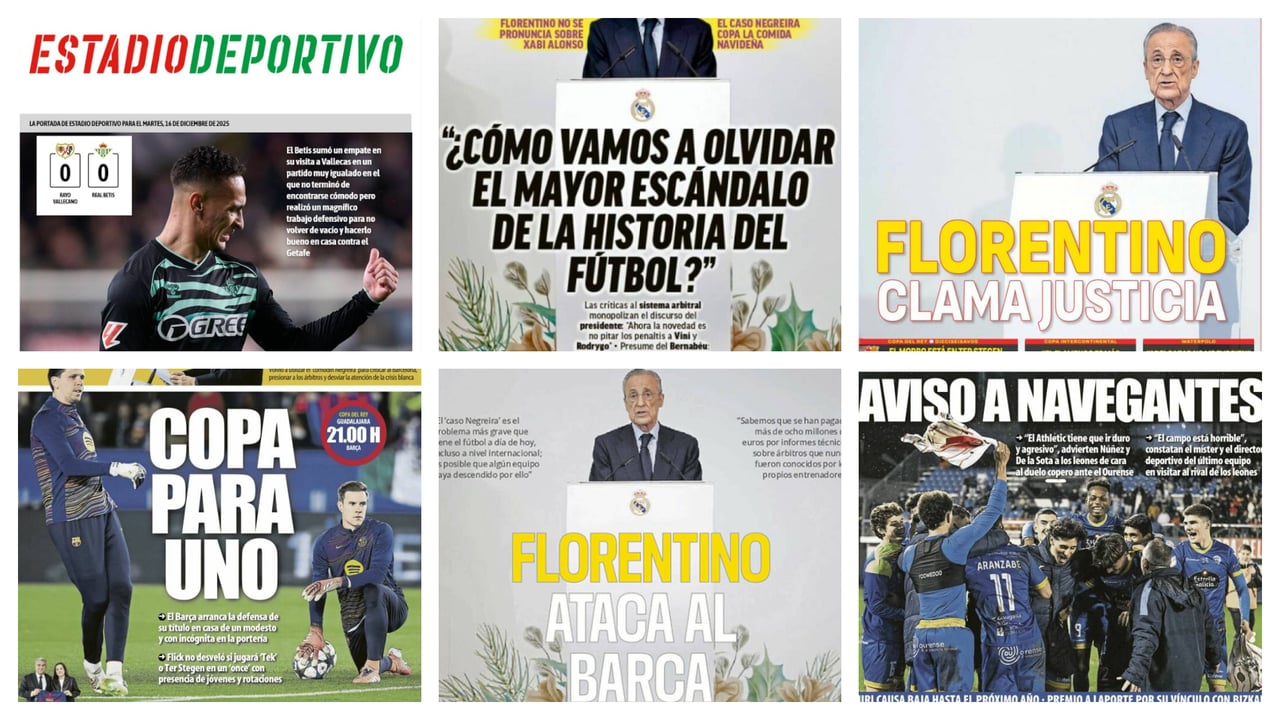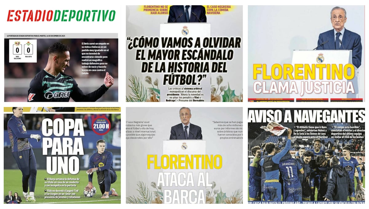 Las portadas de los medios de comunicación deportivos de este martes 16 de diciembre de 2025 llega marcada por el partido del Real Betis contra el Rayo Vallecano, el cual sirvió para cerrar la jornada 16 de LaLiga y que acabó empate a cero, por la Junta General de accionistas del Sevilla FC que giró en torno a la posible compra de un fondo de inversión de Estados Unidos, por las críticas del presidente del Real Madrid, Florentino Pérez, al FC Barcelona ya que pide justicia por el Caso Negreira y por los encuentros de la ronda de dieciseisavos de la Copa del Rey que se disputan durante esta semana.