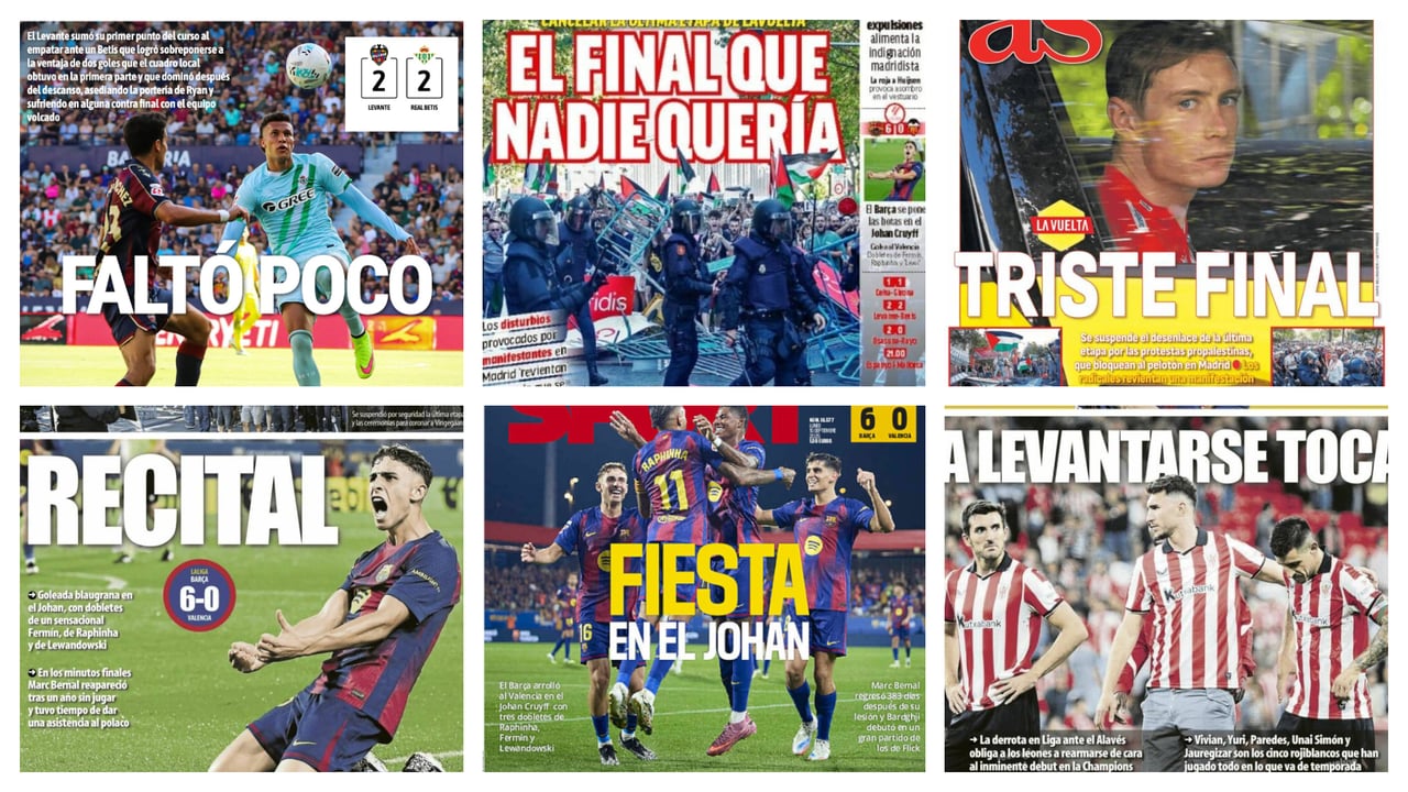 Por otro lado, en el resto de portadas de los medios de comunicación deportivos de España, se destaca mucho la suspensión de la última etapa de La Vuelta a España que ha acabado ganando el danés Jonas Vingegaard. Una gran cantidad de manifestantes a favor de Palestina no dejaron que finalizara la última etapa de la ronda ciclista en Madrid. Toda estas protestas han estado motivadas por la participación del equipo patrocinado por Israel. Finalmente, también hay espacio para la goleada del FC Barcelona al Valencia CF y para la jornada de reflexión de los dos equipos vascos, Athletic Club y Real Sociedad, que sumaron derrotas este pasado fin de semana.