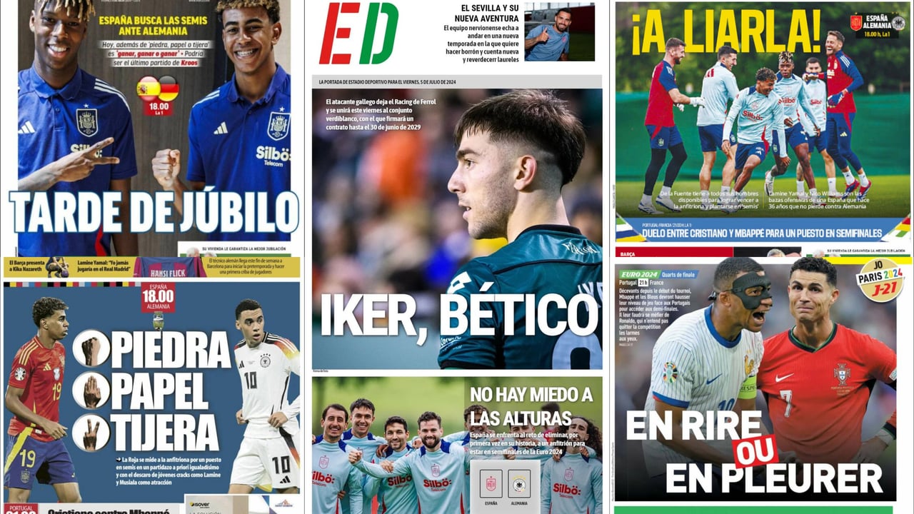 Las portadas de la prensa deportiva de este viernes 5 de julio llegan con un claro protagonista o mejor dicho, protagonistas, y son otros que Luis de la Fuente y sus chicos que esta tarde, a partir de las 18:00 horas, se miden a Alemania en los cuartos de final de la Eurocopa. Así, en ESTADIO Deportivo titulamos: 'No hay miedo a las alturas'. Pues aunque España llega en un gran momento se enfrenta el reto de eliminar, por primera vez en su historia, a un anfitrión para poder estar en la semifinales.