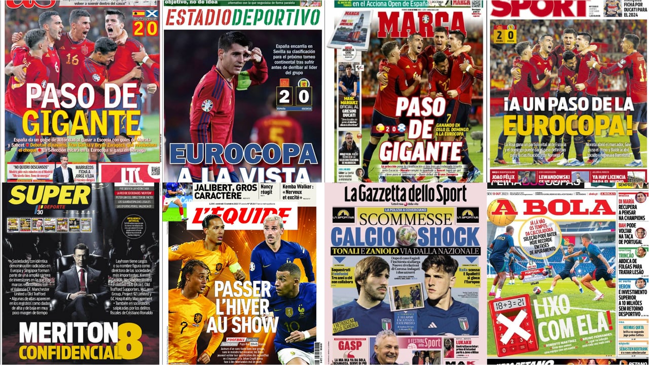 Hay resaca y no sólo por el festivo que se vivió en todo el país el 12 de octubre, con la celebración del Día de la Hispanidad... La Selección Española que dirige Luis de la Fuente supo aprovechar su momento para regalar a los que pudieron disfrutar en el Estadio de La Cartuja de Sevilla una buena victoria ante que Escocia. Con eso... la Eurocopa está más cerca. Precisamente ese es el tema de conversación principal entre las diferentes portadas del país. No es baladí. Otros temas candentes son Márquez y Ducati, las bajas de última hora de la Selección o el fichaje de Jorge Vilda como nuevo seleccionador de Marruecos. La finalidad del país marroquí es que su selección femenina se clasifique para la próxima cita mundialista.