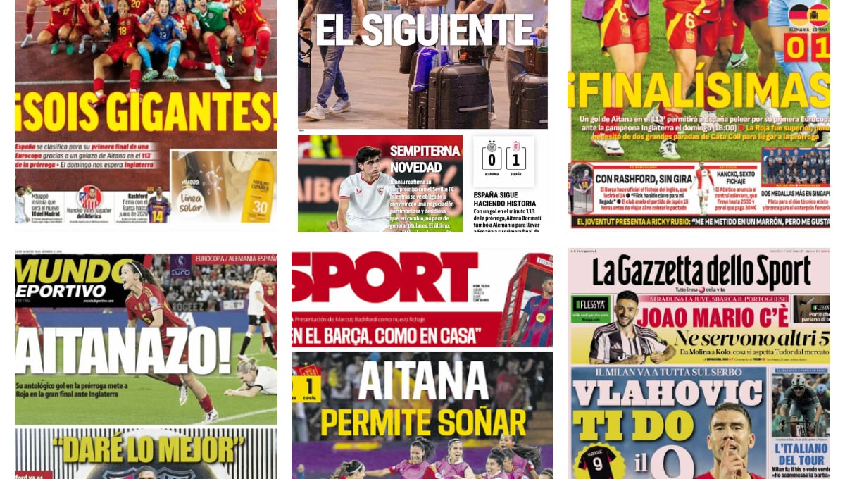 La clasificación de Selección española a la final de la Eurocopa Femenina 2025 es la temática principal de todas las cabeceras en España; donde también destaca la presentación de Marcus Rashford por el FC Barcelona, el fichaje de Valentín Gómez por el Betis y la negociación entre Nápoles y Sevilla por Juanlu Sánchez