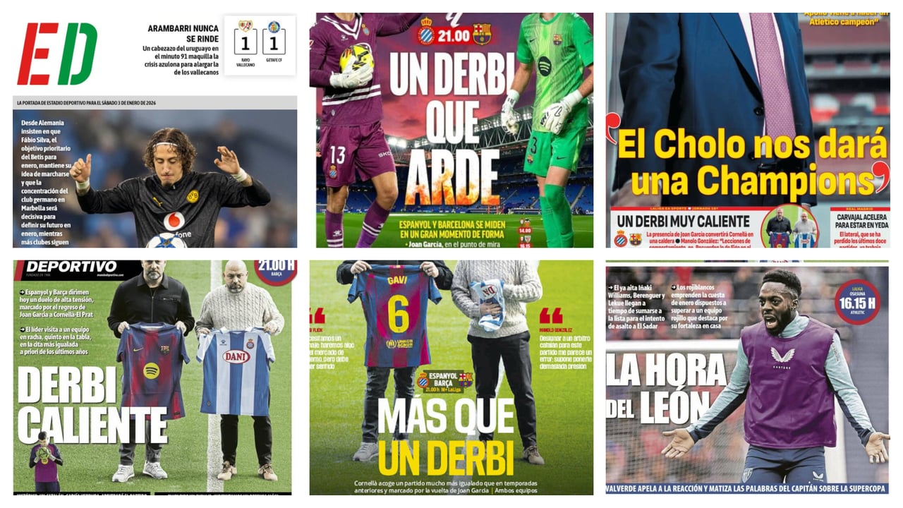 Las portadas de los medios de comunicación deportivos de este 3 de enero de 2026 llegan muy marcadas por el mercado de fichajes de invierno que ya está en plena ebullición y por la disputada de una nueva jornada de LaLiga este fin de semana en lo que es el regreso de la Primera división después de las vacaciones de Navidad. Todos los ojos están puestos en Fábio Silva y el Real Betis, el castigo a Marcao y el interesante derbi catalán entre FC Barcelona y RCD Espanyol.