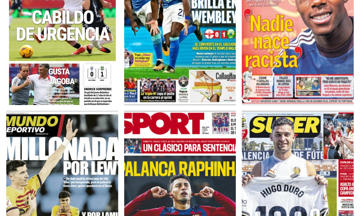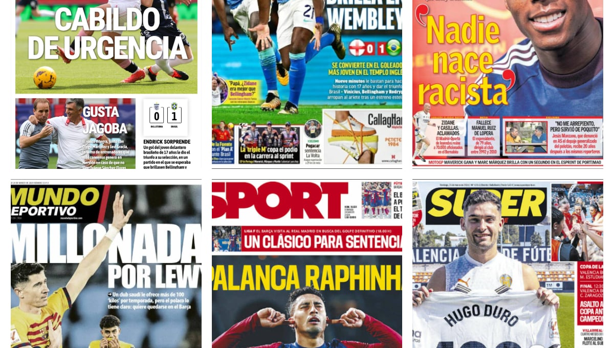 Las portadas deportivas del 24 marzo vienen marcadas por los partidos o actualidad del sábado, donde destaca la victoria de Brasil a Inglaterra, la derrota de Francia, las palabras de Nico Williams y, desafortunadamente, el fallecimiento de Manuel Ruiz de Lopera