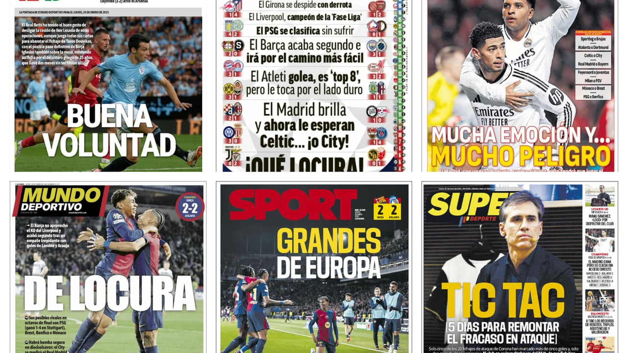 Por supuesto, y como no podía ser de otra manera, la Champions y su última jornada, en la que se han jugado 18 partidos a la vez, ha sido el tema que ha copado las portadas. Marca, con un curioso diseño, repasando todos los marcadores y resaltando los resultados más destacados, ha querido destacar esta fecha, con un titular de lo más contundente: “¡Qué locura!”. Por su parte, As, ha querido ser más específico y se ha centrado en la victoria del Real Madrid, con el siguiente texto: “Mucha emoción y… Mucho peligro”. Asimismo, hay que destacar el aviso que le ha enviado el Gobierno al presidente de la RFEF, Rafael Louzán, en el caso de que este sea inhabilitado en el mes de febrero.