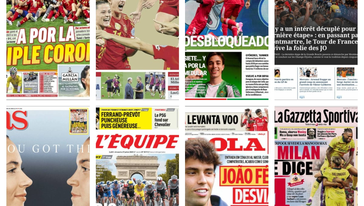 Las portadas deportivas de este domingo 27 de julio vienen marcadas por la final de la Eurocopa Femenina 2025. El equipo de Montse Tomé, quien se clasificó para la última instancia del torneo gracias a un gol de 'pilla' por parte de Aitana Bonmatí, quien comenzó la competición renqueante en plena recuperación de una meningitis vírica, tiene esta noche una cita con la historia. Además de ello, hoy termina la última etapa del Tour de Francia 2025 y en el capítulo internacional, nombres como João Félix ocupan el protagonismo en otra jornada más del mercado.