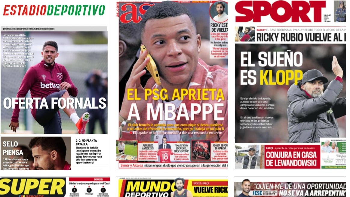 El mes de enero va llegando a su fin y las portadas de los principales diarios deportivos en este martes 30 llegan cargadas de deporte. Con el mercado de fichajes apurando sus últimos coletazos, el asunto de los fichajes siguen copando las primeras páginas. En el Betis se acelera en varios frentes abiertos. Destaca el nombre de Pablo Fornals, jugador del West Ham United. En el Sevilla sale a relucir el de Suso y su posible marcha al fútbol árabe. Otros nombres propios del día son el de Jürgen Klopp, Kylian Mbappé y Ricky Rubio. Mucha información en un momento clave dentro de la ventana invernal de refuerzos.
