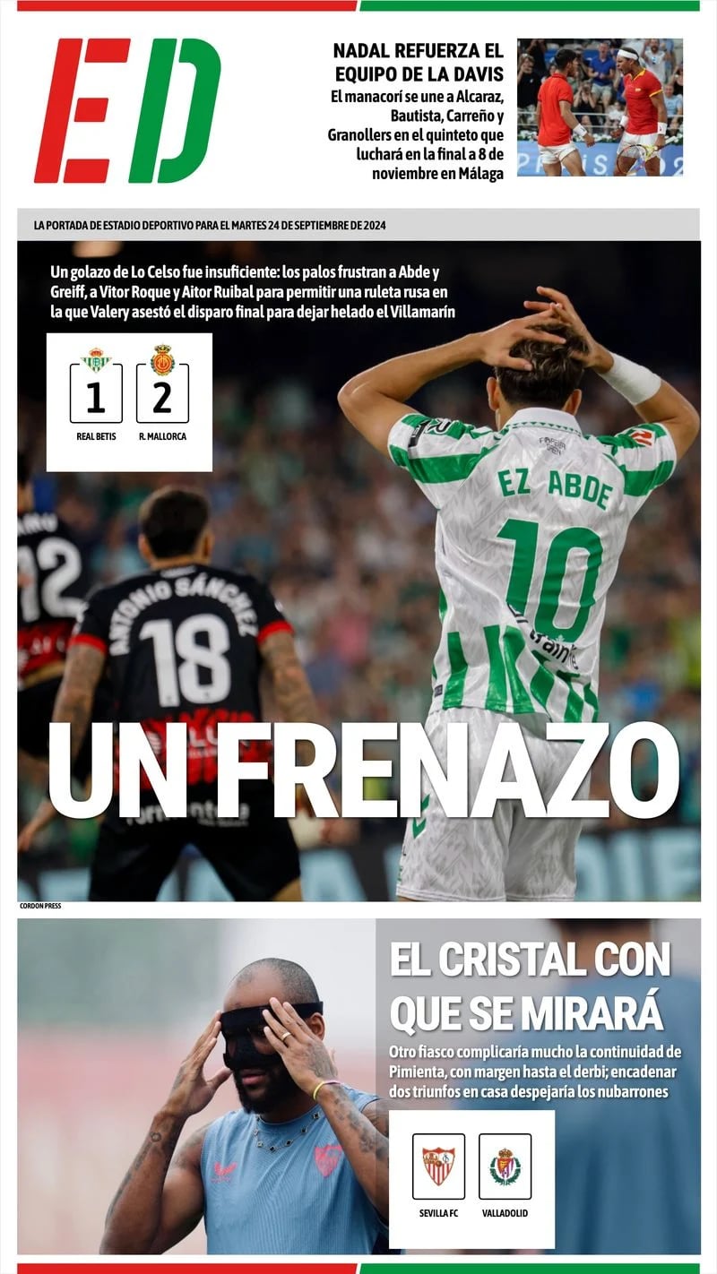 La portada de ESTADIO Deportivo da prioridad a la derrota del Real Betis en el choque liguero frente al Mallorca en el Estadio Benito Villamarín. Un gol en los últimos instantes del juego acabó con el gran juego que estaba desplegando el conjunto verdiblanco. La falta de gol pasó factura al equipo de Manuel Pellegrini. Nadal se unirá al equipo español en la Copa Davis, mientras que el Sevilla se enfrentará en el día de hoy al Real Valladolid en el Ramón Sánchez Pizjuán.