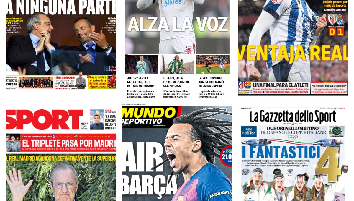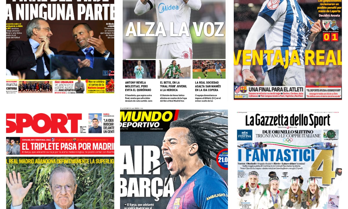 Las declaraciones del jugador del Sevilla, pendiente de su futuro, contra el colectivo arbitral, el punto final a la Superliga europea y los dos partidos de ida de semifinales de Copa del Rey ocupan las portadas de los principales periódicos deportivos
