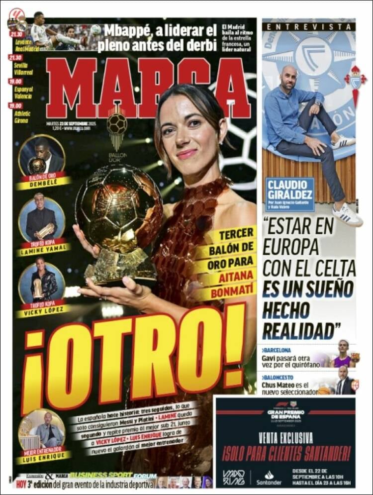 En las portadas de los medios de Madrid, Marca abre con Aitana Bonmatí como la gran protagonista. Hace mención al resto de premiados importantes como Dembélé, Lamine Yamal, Vicky López y Luis Enrique. Hace alusión al comienzo de la jornada de LALIGA con Mbappé como protagonista e incluye un extracto de la entrevista a Claudio Giráldez, entrenador del Celta. Por último, también incluye el fichaje de Chus Mateo y el paso por el quirófano de Gavi. AS deja el gran grueso de su portada a Dembélé y Aitana e incluye la reunión de los agentes de Vinicius con el Real Madrid como novedad.