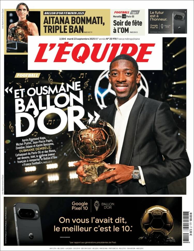 L'Equipe abre en Francia con Dembélé copando el grueso de su portada mencionando a los premiados franceses en la historia del Balón de Oro y hace una pequeña mención al de Aitana Bonmatí.