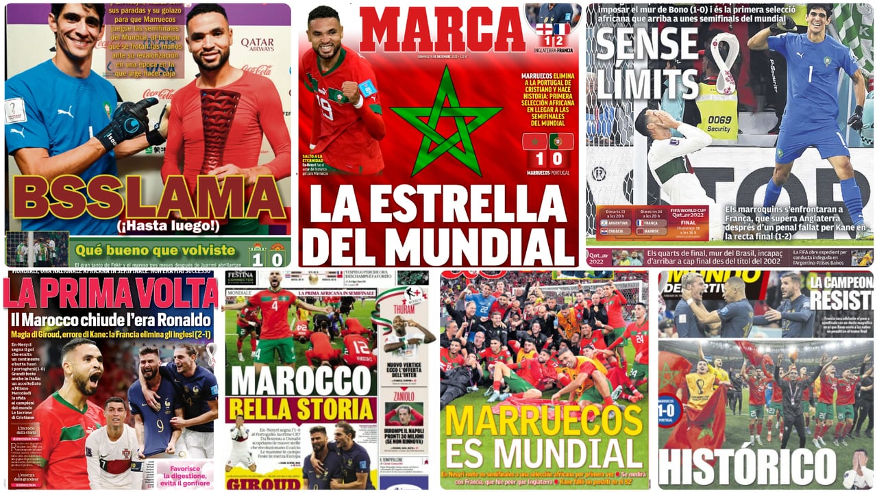 'Bsslama' (hasta luego, en árabe) es el titular de la portada de ESTADIO Deportivo, que apuesta por esa foto que es un ejemplo de compañerismo. 'La estrella del Mundial', abre el diario Marca con una foto de En-Nesyri y la bandera marroquí. 'Sin límites', destaca el catalán L'Esportiu con una imagen de Bono. 'Marruecos es Mundial', dice As; 'Histórico', apunta Mundo Deportivo. El delantero del Sevilla FC también sale en la imagen principal de la portada del Corriere dello Sport italiano, mientras que La Gazzetta dello Sport apuesta por otro de los destacados, el omnipresente mediocentro Amrabat. Evidentemente, también son portada en Portugal, aunque los periódicos lusos lo enfocan por la decepción propia, con imágenes de un abatido Cristiano Ronaldo.