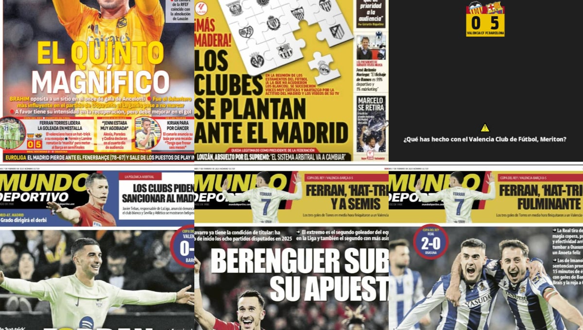 El Barcelona goleó al Valencia y ya está en semifinales de Copa del Rey, los clubes van contra el Real Madrid por el tema de los árbitros y Akor Adams, lesionado nada más llegar, protagonizan las portadas del 7 de febrero