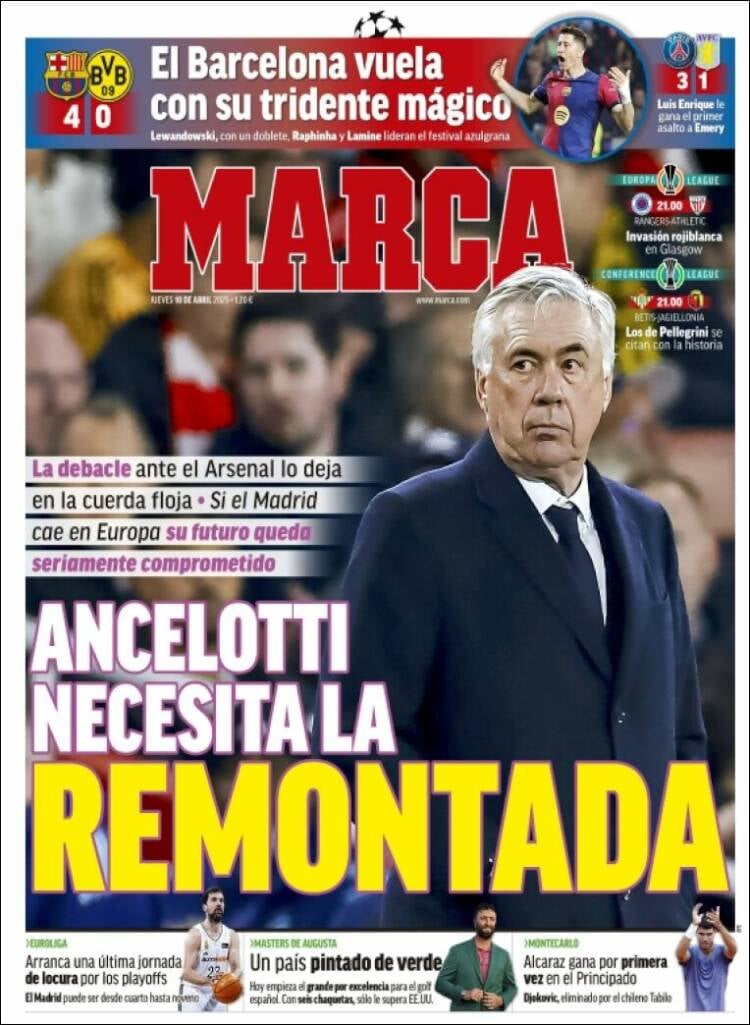 Las portadas deportivas de este jueves 10 de abril de 2025 vienen marcadas por los partidos de ida de los cuartos de final de la Champions League. La jornada europea nos está dejando muchas sorpresas, que copan todas las cabeceras de los principales diarios de nuestro país. El FC Barcelona da un importante golpe sobre la mesa en Montjuic, cosechando una nueva goleada en la máxima competición a nivel de clubes. Por su parte, el Real Madrid se aferra a la remontada en el Santiago Bernabéu; aunque Carlo Ancelotti está en el punto de mira. El Real Betis disputará uno de los duelos más importantes de su historia, donde se medirá al Jagiellonia.
