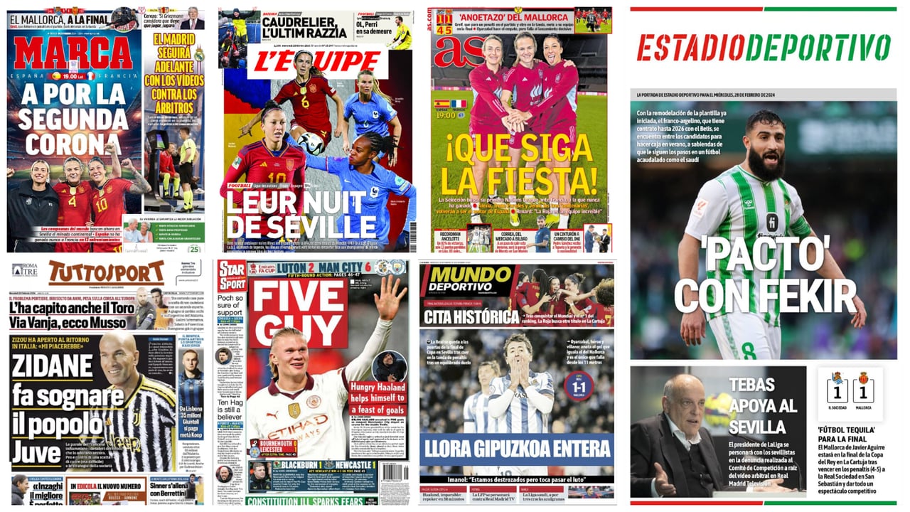 El repaso de prensa con las portadas de los principales periódicos deportivos para este miércoles 28 de febrero anuncia fiesta en Sevilla. Y no sólo porque hoy se celebra el Día de Andalucía, sino porque el estadio de La Cartuja de la capital andaluza acoge la gran final de la Liga de Naciones de la UEFA en la que la selección española femenina se enfrenta a la francesa con la oportunidad de conquistar un nuevo título. También luchará por ampliar su palmarés el RCD Mallorca, que dejó helado al donostiarra estadio de Anoeta y se clasificó para jugar la tercera final de Copa del Rey de su historia tras vencer a la Real Sociedad en una eliminatoria de semifinales que se decidió en la tanda de penaltis.
