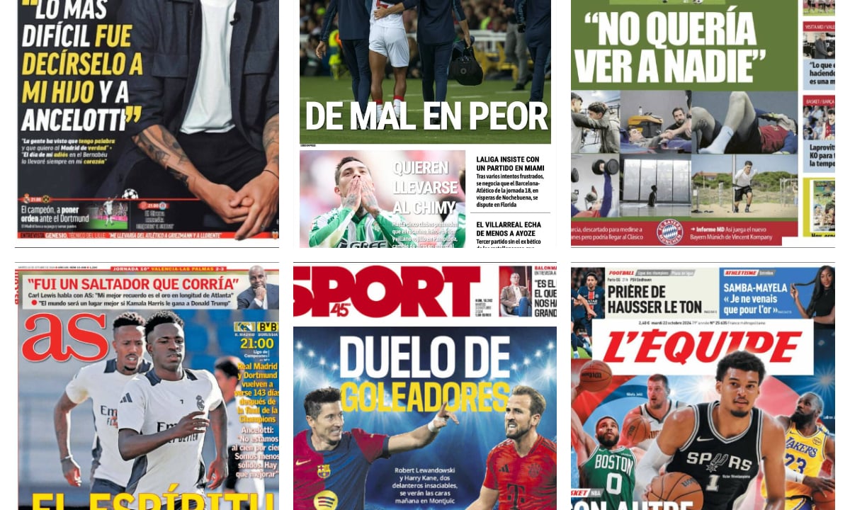 Este martes 22 de octubre las portadas de los diferentes diarios deportivos prestan especial atención al regreso de la UEFA Champions League con varios duelos emocionantes. El Real Madrid se medirá al Borussia Dortmund después de arrebatarles el título más importante a nivel de clubes el curso pasado. El FC Barcelona ya está centrado en el choque europeo contra el Bayern Munich. El conjunto culé y Hansi Flick se presentan con ganas de revancha tras lo ocurrido años anteriores. El Betis está pendiente del Chimy Ávila, mientras que el Sevilla ya busca soluciones para paliar la importante lesión de Ejuke.