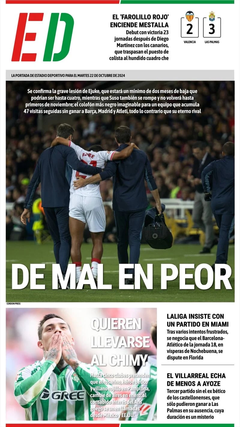 La portada de ESTADIO Deportivo da prioridad a la derrota del Sevilla FC frente a los equipos más importantes de España. Además, la lesión de Ejuke supone un nuevo problema para García Pimienta que deberá tratar de solventar en las próximas semanas. Termino la jornada en LaLiga EA Sports con un importante encuentro en el 'Farolillo Rojo' de la tabla clasificatoria. Por otro lado, el Real Betis está muy pendiente de la situación del Chimy Ávila en la escuadra heliopolitana.