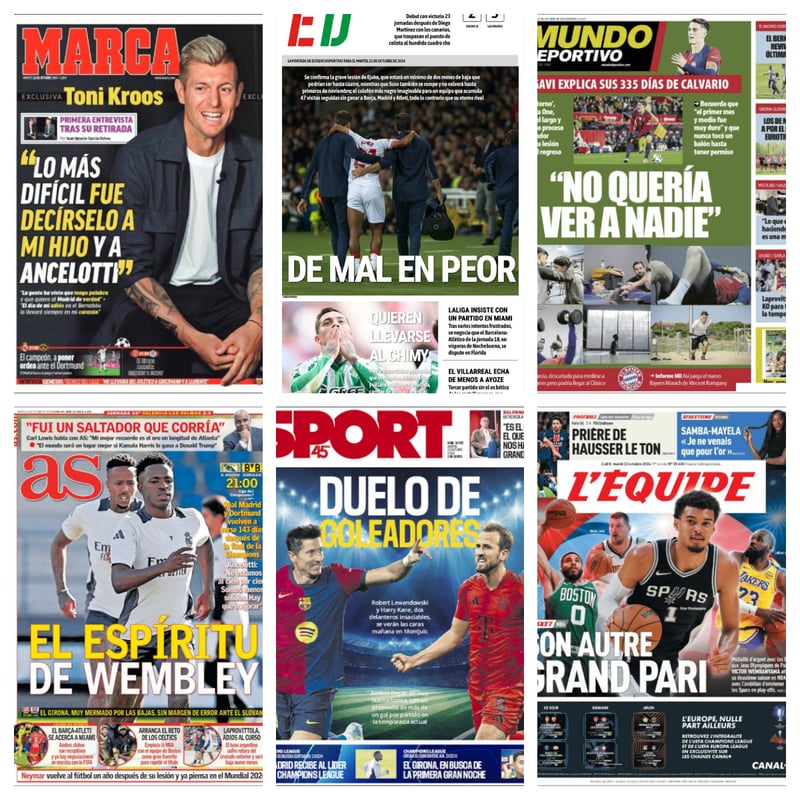 En el caso de Diario Marca, la portada se centra en una entrevista en exclusiva realizada al ex futbolista del Real Madrid Toni Kroos. El alemán ha declarado que lo más difícil de tomar la decisión de retirarse fue desvelarle su plan a su hijo y a su entrenador Carlo Ancelotti. Por su parte, Diario AS pone el foco en la vuelta del conjunto blanco a su competición fetiche con una reedición de la pasada final de la Champions League. El Valencia - Las Palmas ha puesto fin a esta jornada liguera con un polémico duelo por salir de la zona baja de la tabla.