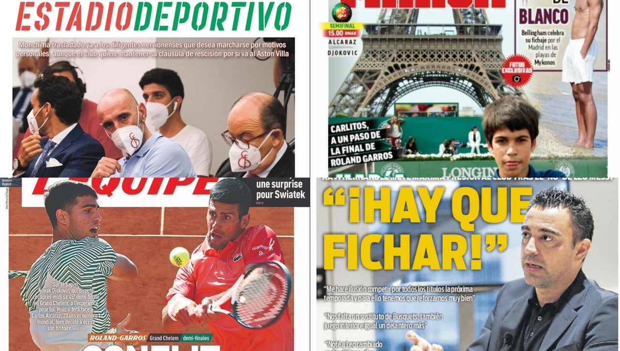 Lejos del fútbol, hoy los focos estarán en Roland Garros donde el español Carlos Alcaraz y el serbio Novak Djokovic se miden en semifinales en busca de un puesto en la final del torneo parisino, sin duda, el partido más esperado. Tras este se enfrentarán el noruego Casper Ruud y el alemán Alexander Zvererv. Son varios los medios que llevan a sus portadas este enfrentamiento, entre ellos Marca y L'Équipe.