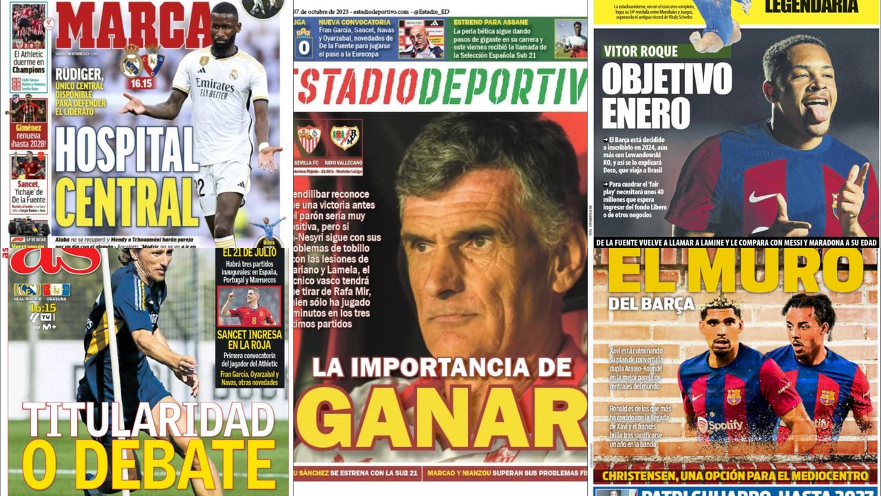 También juega hoy el Real Madrid y así lo recoge la prensa madrileña, sobre todo por los problemas defensivos que tiene Ancelotti. 'Hospital central', titula Marca en referencia a las bajas en el centro de la defensa que tiene el técnico blanco, pues Rüdiger es el único central disponible para jugar esta tarde frente al Club Atlético Osasuna. El austríaco David Alaba se queda por tercer partido consecutivo fuera de una convocatoria del Real Madrid, al sufrir una lesión en el abductor derecho el pasado 27 de septiembre, en la que tampoco está Nacho Fernández, quien cumplirá frente a Osasuna su primer, de tres, partidos de sanción tras la roja que vio el pasado sábado contra el Girona. Unas bajas en el centro de la zaga que se unen a la de larga duración del brasileño Éder Militao y que hacen que el técnico italiano Carlo Ancelotti vuelva a contar con el español Álvaro Carrillo, central y capitán del Real Madrid Castilla de Raúl González Blanco. También está por ver si sale de inicio Luka Modric, que no está jugando todo lo que desearía: 'Titularidad o debate' aparece en la portada del diario As.