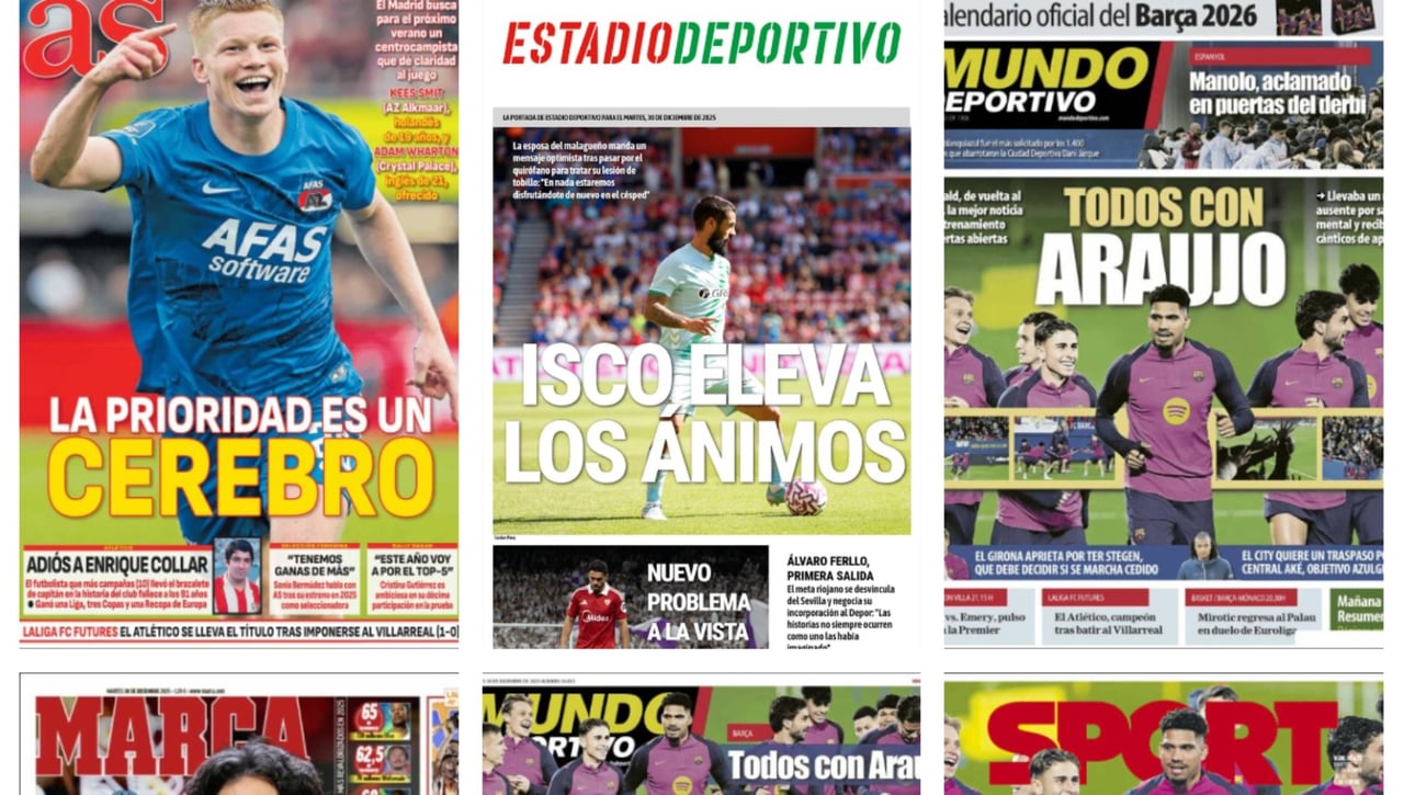 Isco se opera, el Real Madrid busca creación en el centro del campo, el Barcelona recupera a Araujo... Así vienen las portadas de la prensa deportiva