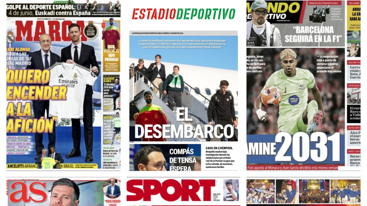 Isco, Xabi Alonso y Lamine Yamal protagonizan las portadas deportivas de España en el día 27 de Mayo de 2024. El futbolista verdiblanco, que está concentrado junto al resto de sus compañeros en Polonia para la final de la UEFA Conference League, regresa a la Selección española para jugar la Final Four de la UEFA Nations League. Por otro lado, Xabi Alonso ya ha sido presentado como nuevo técnico del Real Madrid y admite que siete que era el momento de aterrizar en el club blanco. Además, en el Barcelona ya tienen encarrilada la renovación de Lamine Yamal que renovará con el club blaugrana hasta 2031.