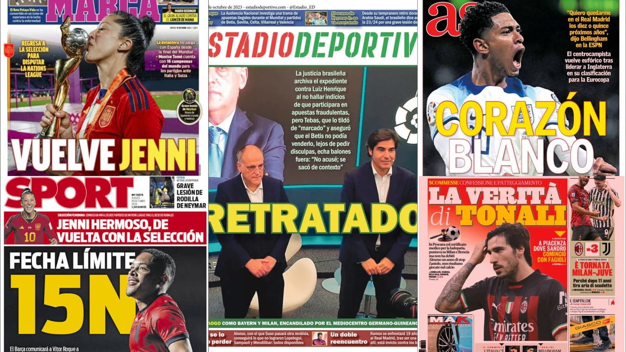 Las portadas de la prensa deportiva de este jueves 19 de octubre vienen con muchísima información y con una clara protagonista que aparece en todas ellas, la futbolista de la selección española Jenni Hermoso, que vuelve a una lista de convocados de la actual campeona del mundo tras todo la polémica por el 'caso Rubiales'.
