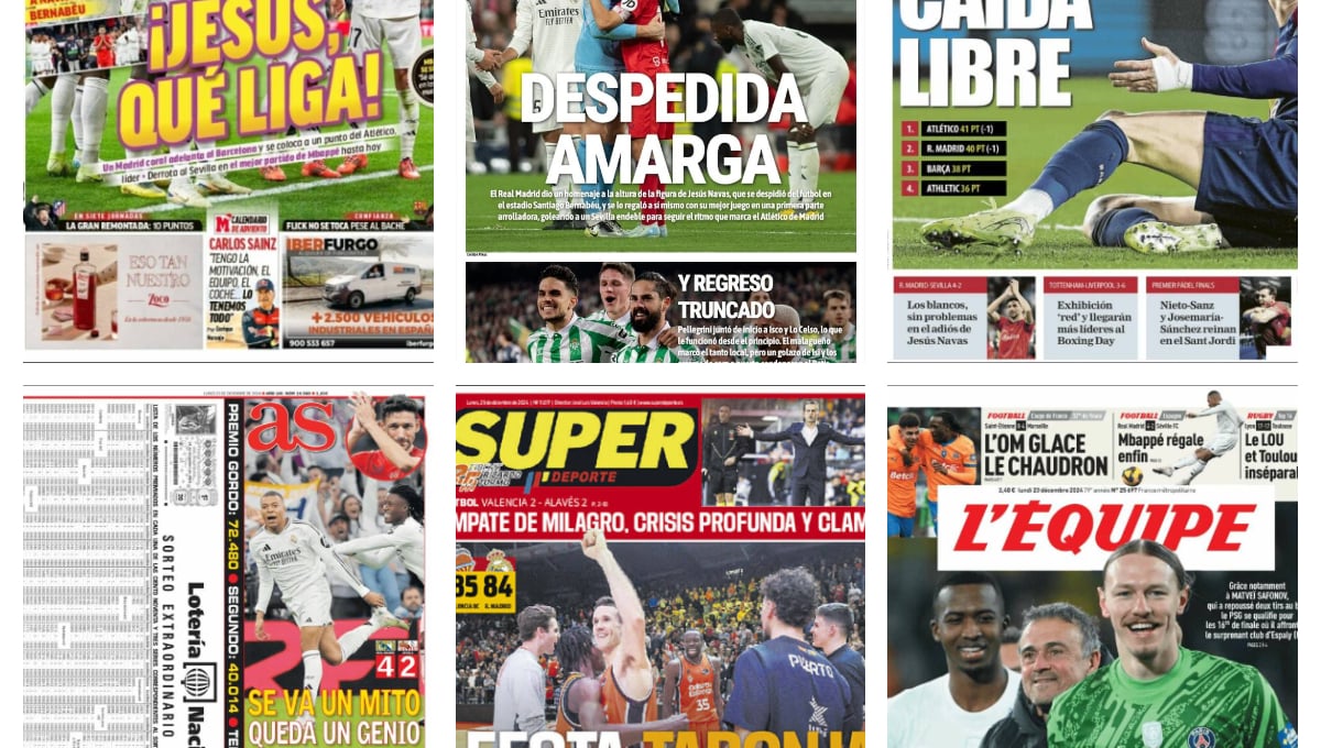 Las portadas del 23 de diciembre tienen como protagonista a Jesús Navas. En Madrid se rinden a la longeva carrera deportiva del canterano sevillista. AS titula: 'Se va un mito; queda un genio', en referencia a Kylian Mbappé. El francés abrió la lata con un golazo desde fuera del área. Por su parte, el diario Marca abre con: ¡Jesús, qué liga! (el emotivo adiós a Navas en el Bernabéu).
