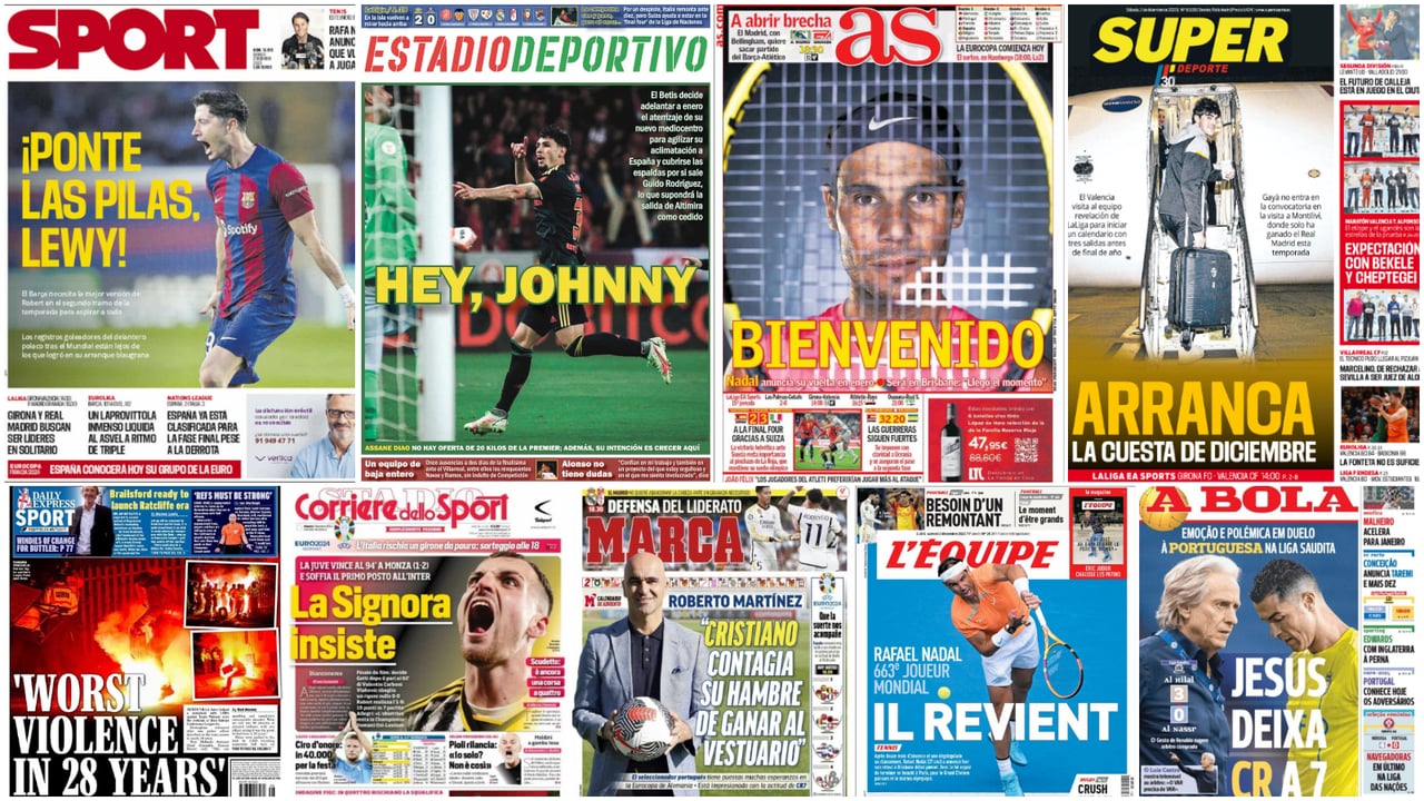 Johnny Cardoso y su inminente llegada al Real Betis, Diego Alonso y su más que cuestionado futuro como entrenador del Sevilla FC, el deseadísimo Nico Williams y su renovación por el Athletic Club, Robert Lewandowski y su preocupante bajada de nivel con respecto al primer año en el FC Barcelona, los gravísimos incidentes en Birmingham entre la policía inglesa y los exaltados aficionados del Legia de Varsovia en el partido de Conference League frente al Aston Villa y, sobre todo, el regreso de Rafa Nadal a las pistas de tenis. Estos son algunos de los nombres propios en el repaso a las portadas de los principales periódicos deportivos en este sábado, día 2 de diciembre de 2023.