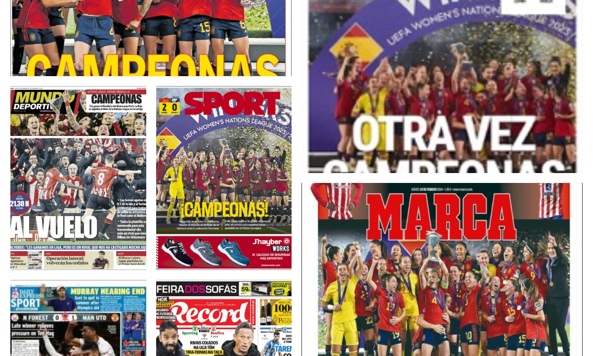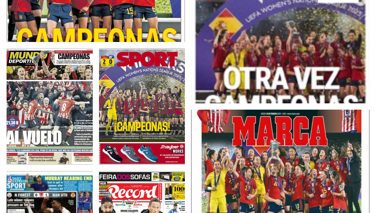 El repaso de la prensa deportiva de este jueves 29 de febrero de 2024 tiene a unas protagonistas por encima de todo, las chicas de la Selección Española femenina de fútbol, que anoche hicieron historia levantando en La Cartuja la Nations League de la UEFA, el segundo título de historia. Un título que quieren disputar Athletic Club de Bilbao y Atlético de Madrid es la Copa del Rey, pero para jugárselo ante el Mallorca en la final, precisamente en el mismo sitio, el 6 de abril, deberán salir victoriosos de la 'final' de San Mamés, donde los madrileños tendrán que remontar en uno de los campos más complicados de LaLiga.