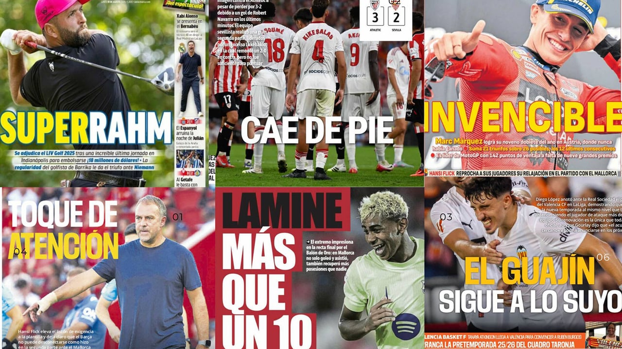 Rahm y Marc Márquez le roban protagonismo a la jornada liguera en las portadas deportivas de este lunes 18 de agosto, con cabida para la derrota del Sevilla en San Mamés