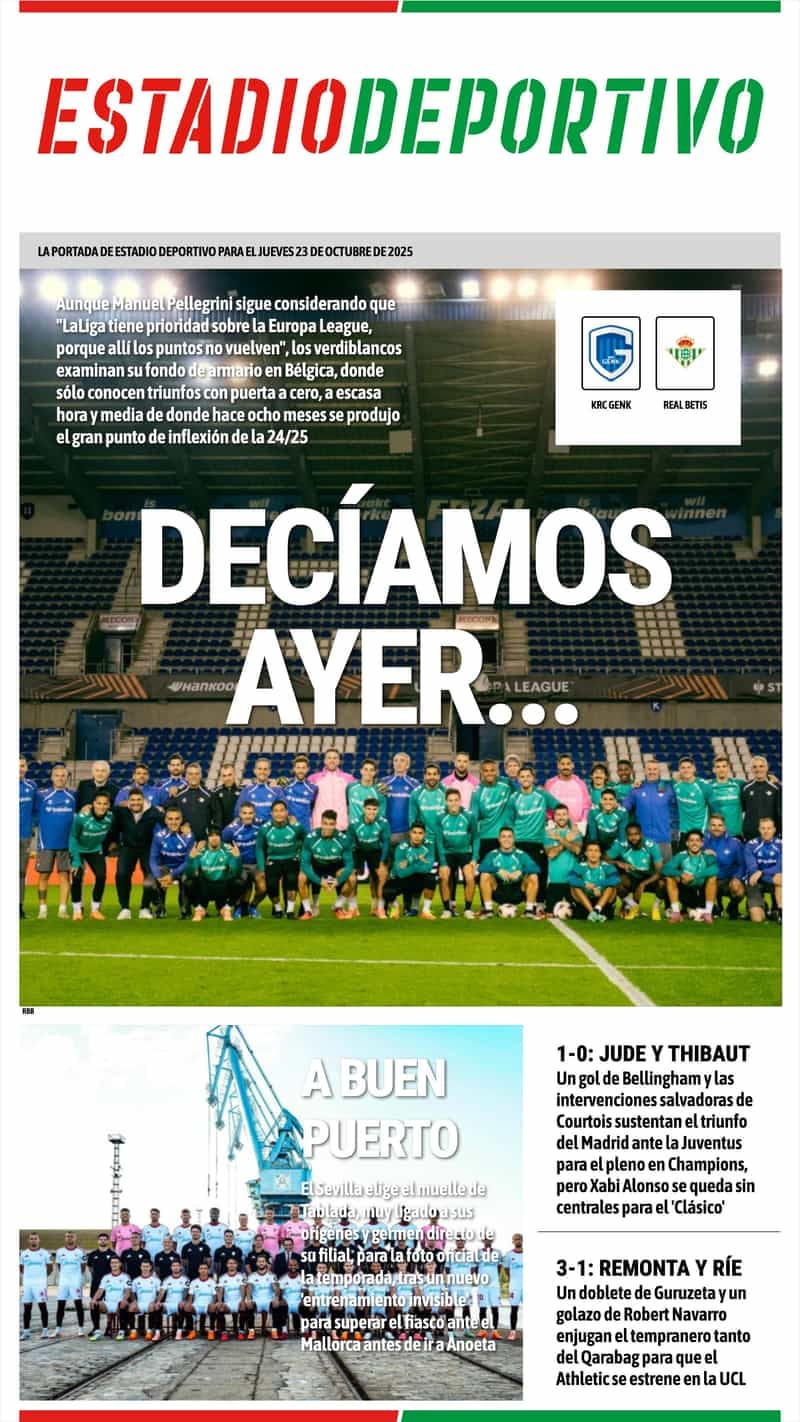 En ESTADIO Deportivo hemos abierto con el duelo europeo del Real Betis ante el KRC Genk, donde el equipo de Pellegrini busca mantener su racha triunfal en Bélgica mientras el técnico recuerda que “LaLiga tiene prioridad”. Además, destacamos que el Sevilla FC realizó su foto oficial en el muelle de Tablada, Sevilla, un lugar simbólico vinculado a sus orígenes, tras centrarse en recuperar sensaciones antes de visitar Anoeta para medirse a la Real Sociedad en LaLiga.