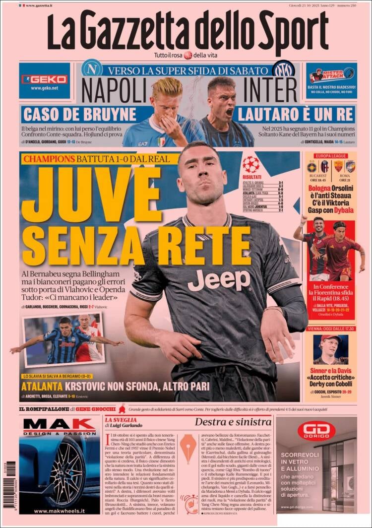 Por otro lado, en los medios internacionales, tanto la prensa portuguesa como la francesa hablan del Sporting 2-1 Marsella, centrándose en sus respectivos equipos nacionales. Por último, en Italia, La Gazzetta dello Sport dedica su portada al gran partido de la Juventus pese a la derrota, y al empate del Atalanta.
