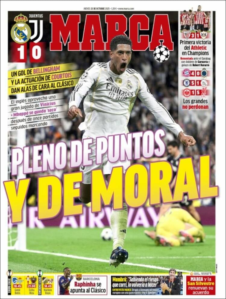 Las portadas de este jueves 23 de octubre de 2025 vienen marcadas por la jornada de la Champions League, donde la apretada victoria del Real Madrid ante la Juventus ocupa un papel significativo en todas las portadas nacionales. Por otro lado, el primer triunfo del Athletic Club en la presente Champions League también toma un lugar especial, mientras que, un FC Barcelona que se ha reencontrado con su mejor juego ante del ‘Clásico’, ocupa la primera plana en muchos periódicos.