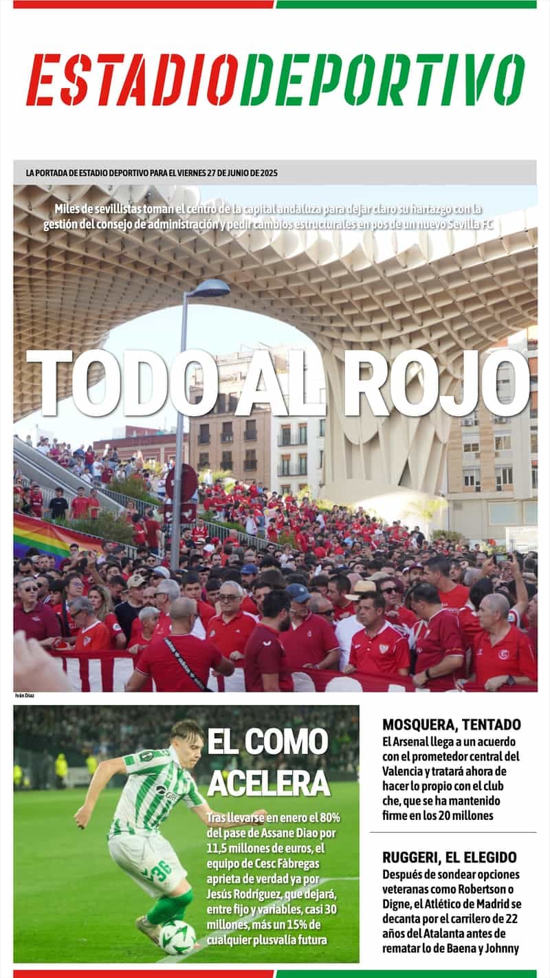 En cuanto a la portada de este medio, hay dos temas que se deben resaltar en la previa del fin de semana. El primero está directamente relacionado con el hartazgo de la afición del Sevilla por la gestión del consejo de administración. Con el titular ‘Todo al rojo’, se refleja la salida a las calles de la ciudad de miles de seguidores del cuadro que suele disputar sus choques en el Sánchez Pizjuán. Todo, con el objetivo de solicitar una serie de “cambios estructurales” para mejorar la situación de la institución.
