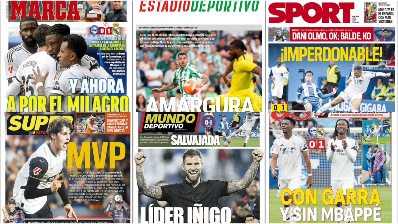 Las portadas de la prensa deportiva nacional en este lunes 14 de abril de 2025 se hacen eco de una nueva jornada de LaLiga EA Sports, la número 31, en la que el Real Madrid aguantó con un hombre menos en Mendizorroza ante el Alavés tras la expulsión de Kylian Mbappé a los 38 minutos por una dura entrada sobre Antonio Blanco. La peligrosa acción del delantero galo para hacerse con un balón en la medular, que fue castigada inicialmente con amarilla y tras acudir el colegiado César Soto Grado al vídeo con la roja directa, complicó el partido al conjunto esta vez dirigido desde el banquillo por Davide Ancelotti, ya que su padre Carlo estaba sancionado por acumulación de amonestaciones y siguió el choque desde una cabina del estadio vitoriano.