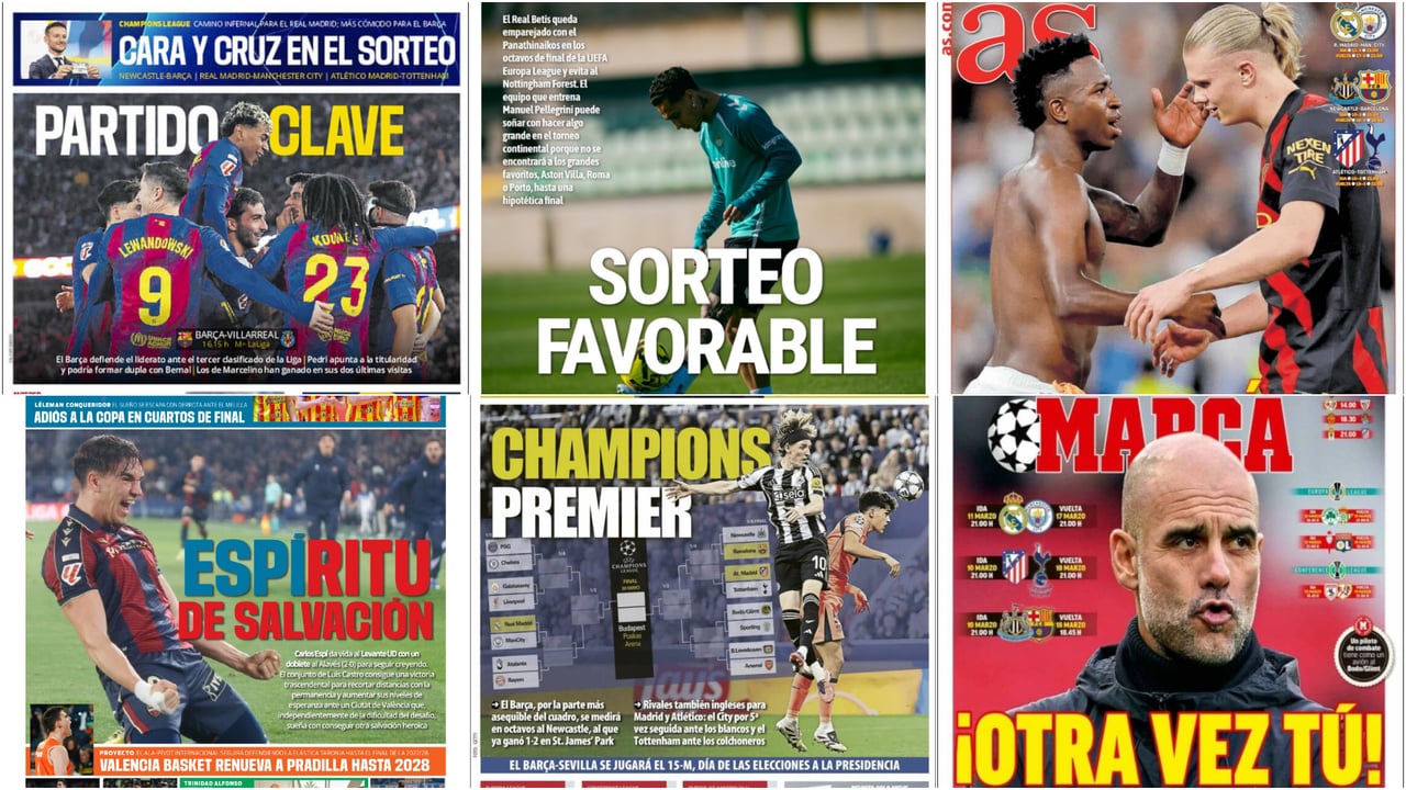 Las portadas de la prensa deportiva de este sábado 28 de febrero se hacen eco de los sorteos de la Champions y la Europa League, con desigual suerte para los equipos españoles. Así, el camino más duro en la máxima competición continental será para un Real Madrid que repetirá en octavos ante el Manchester City lo que ya es otro clásico en la Liga de Campeones. Mientras tanto, el Barcelona evitó el cruce con el PSG y se medirá al Newcastle y el Atlético de Madrid también esquivó al Liverpool para jugarse el pase con el Tottenham.