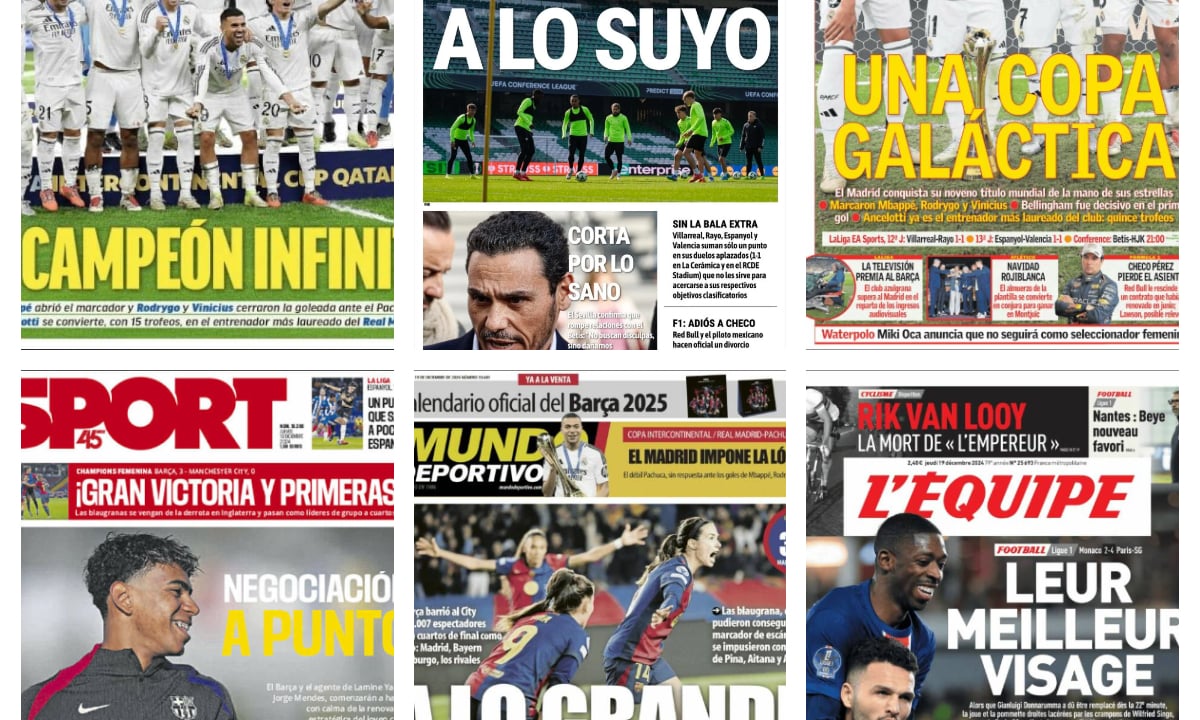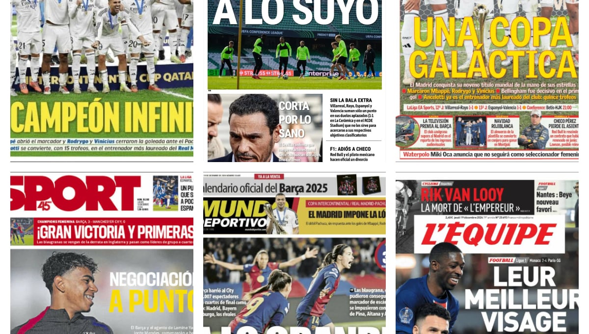 Las portadas de este jueves 19 de diciembre vienen marcadas por dos temas principales, la victoria del Real Madrid frente a Pachuca en la Intercontinental para proclamarse campeones del título y la goleada del FC Barcelona Femenino contra el Manchester City. Además, el corte de las relaciones entre Sevilla y Betis o el golpe que recibió Donnarumma también acaparan protagonismo.