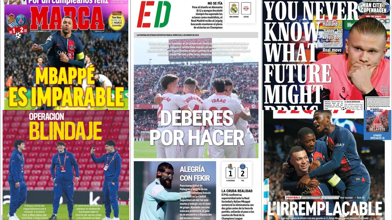 La figura de Mbappé sobresale del resto en las portadas de hoy tras su partidazo ante la Real Sociedad, y desde Inglaterra llevan a sus primeras páginas las palabras de Haaland dejándose querer por los blancos...