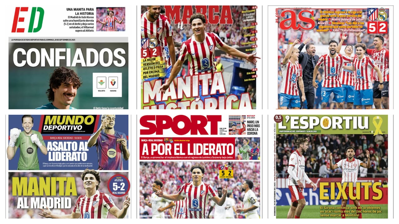 Las portadas deportivas de este domingo 28 de septiembre de 2025 vienen marcadas por la victoria del Atlético de Madrid sobre el Real Madrid. Los de Simeone sacaron el rodillo en el Metropolitano para vencer por 5 a 2 al desdibujado equipo de Xabi Alonso. Este resultado puede valerle al FC Barcelona para colocarse líder en la clasificación de LaLiga si es capaz de vencer a la Real Sociedad esta tarde, a parir de las 18.30 horas. Por otro lado, la prensa se hace eco de las históricas medallas de oro y bronce conseguidas por las españolas en los mundiales de ciclismo femenino. Paula Ostiz se colgó el oro en la categoría junior, mientras que, l eterna Mavi García, obtuvo la medalla de bronce en la categoría absoluta.