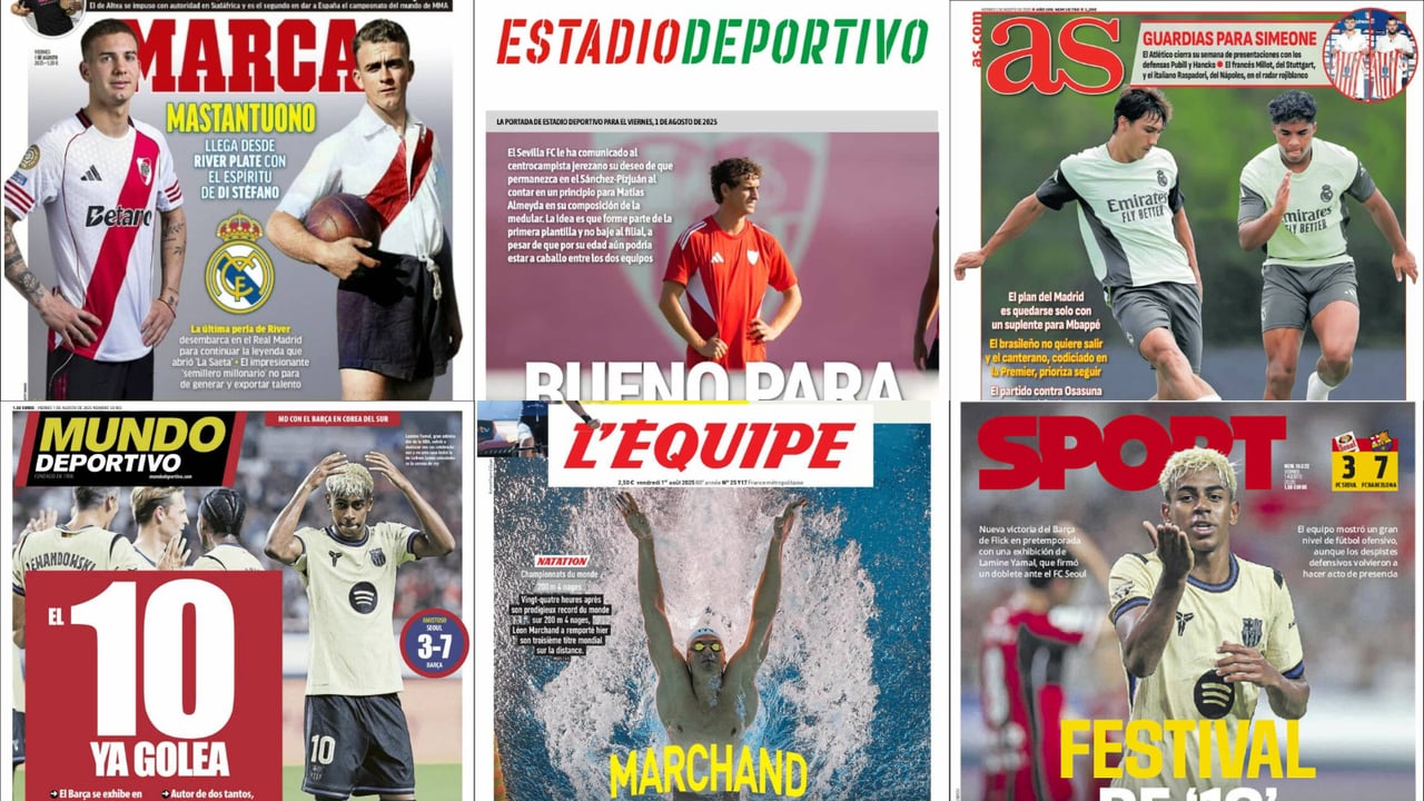 Las portadas del 1 de agosto están cargadas de deporte, especialmente fútbol. Pero más allá del 'deporte rey' también hay espacio para otras disciplinas como la natación, que está viviendo estos días su Mundial desde Singapur y que está teniendo a varias estrellas, algunas ya confirmadas, otras emergentes. El diario Marca habla de Mastantuono y cómo el argentino sigue el legado de Di Stefano. El diario AS apunta la cuestión del Real Madrid de sí Endrick o Gonzalo como suplente para Mbappé y con el difícil encaje de ambos jugadores.