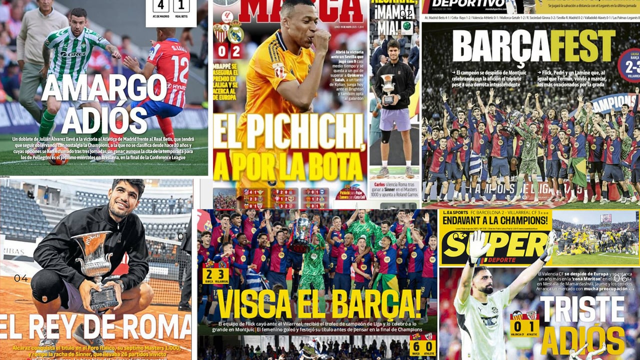 La penúltima jornada de LaLiga, Mbappé, Carlos Alcaraz, la celebración culé y la derrota del Betis comparten protagonismo en las primeras páginas de hoy, lunes 19 de mayo