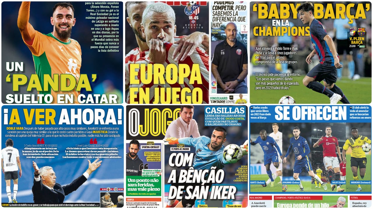 La música de la Champions sonará este martes por última vez para el Atlético de Madrid y el FC Barcelona, mientras que mañana miércoles la despedida será para el Sevilla FC. Al menos, nervionenses y culés ya tienen asegurado seguir en competición continental al ser matemáticamente terceros de sus grupos; pero los colchoneros han viajado a Oporto con la necesidad de sacar un buen resultado para obtener también billete para la Europa League, competición en la que, también junto a Real Betis y Real Sociedad, podría haber cinco representantes de LaLiga. Borja Iglesias y el Mundial de Qatar, Andrés Iniesta y una posible vuelta de Messi, el mercado de fichajes de enero o la posible sanción a la que se enfrenta Carlo Ancelotti son otros de los temas del día en el repaso a las principales portadas de este martes, 1 de noviembre.