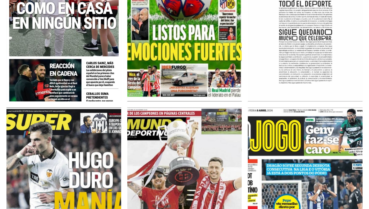 Además, el resto de equipos españoles, ajenos a lo que sucede en Europa, siguen con sus objetivos en este tramo final de temporada. Los jugadores del Athletic, que siguen de celebración al conquistar su 25.º Copa del Rey ante el Mallorca en la tanda de penalti, llevaron ayer el título a Bilbao y están a la espera de sacar la gabarra el jueves 11 para disfrutar junto a su afición del clásico recorrido del equipo por la ría. Igualmente, la delantera del Barcelona toma protagonismo como fórmula para ganar al PSG en el partido de ida que se disputará el miércoles. Las figuras de Lamine Yamal, Robert Lewandoswki y Raphinha -olvidándose de Joao Félix- se erigen como los responsables de una posible buena actuación del equipo culé ante los parisinos que les dé un colchón de ventaja para recibirlos después en Montjuic. Hugo Duro y Mikel Merino también son las caras más reconocidas por sus equipos en las portadas.