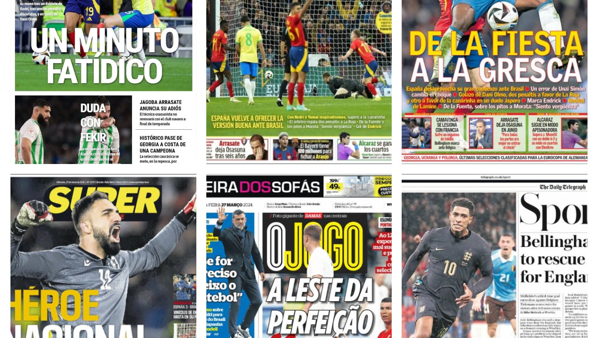 Con respecto al partido que se disputo ayer a las 21:30 horas en el Santiago Bernabéu, españoles y brasileños empataron a tres. El conjunto nacional se puso 2-0 en el minuto 36, ofreciendo un espectáculo de fútbol a un estadio que presentó una entrada magnífica, llenando el campo entero prácticamente. Un error en la salida de Unai Simón le puso en bandeja el gol a Rodrygo Goes. En la segunda mitad, otro pequeño errores del guardameta vasco facilitó el gol de Brasil. Y en los minutos finales, Rodri y Lucas Paquetá metieron sus respectivos penaltis para establecer el empate en el marcador. En el postpartido, la ovación que se llevó Lamine Yamal por parte de la grada del coliseo madridista, las declaraciones de Rodri sobre el comportamiento de los jugadores brasileños y la decepción de Luis de la Fuente al escuchar los pitos que recibió el capitán de la Selección, Álvaro Morata, fueron los temas a destacar.